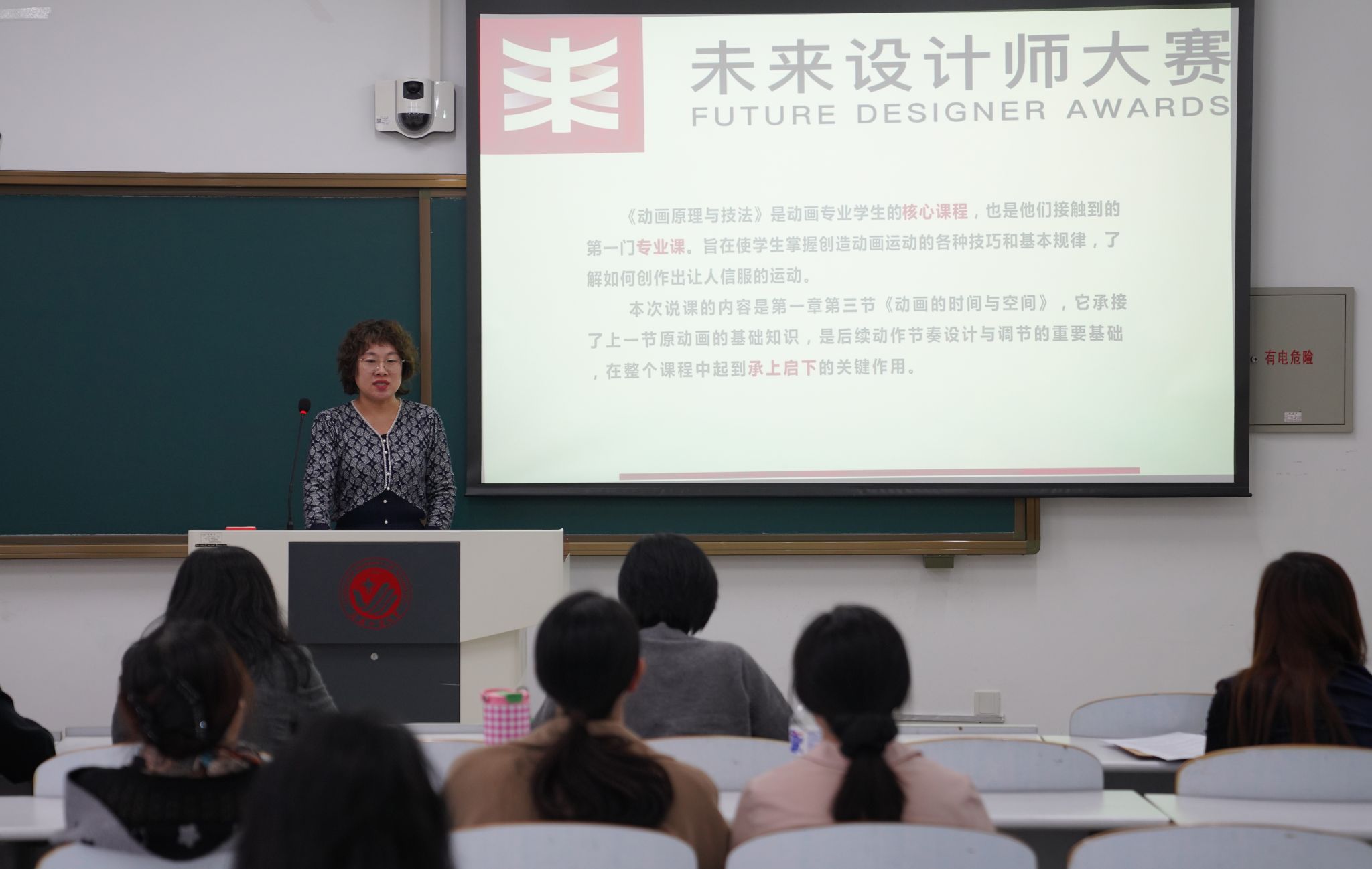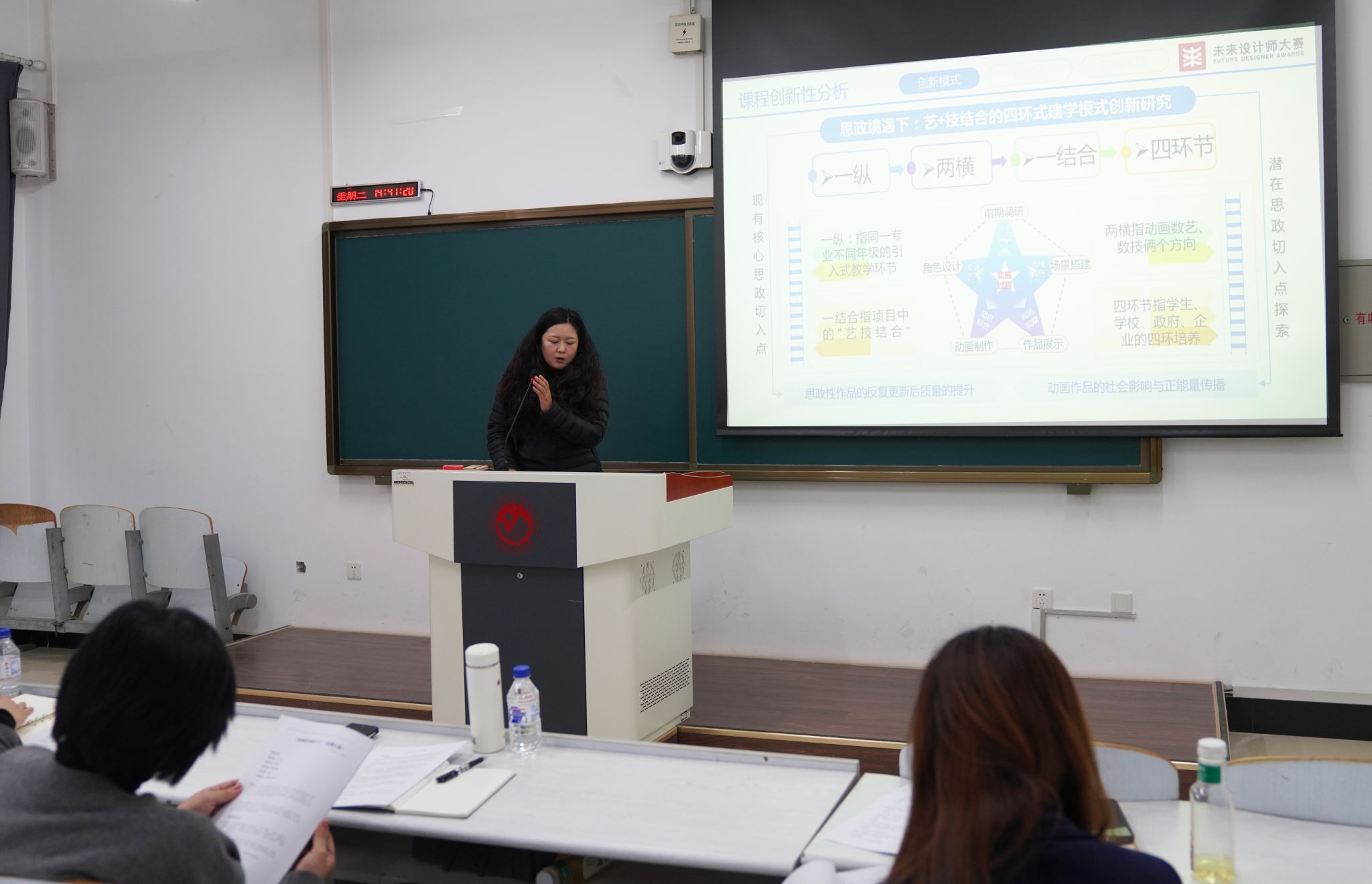 活动中视觉传达设计专业主讲《流行色——色彩权利与话语权的全球博弈》课程的山川老师,动画专业主讲《动画原理与技法》课程的于冰老师、主讲《动画软件基础C1》课程的王盈舒老师,三位老师以说课形式,聚焦本科课程教学设计的科学性与创新性。从教学目标设定、教学内容重构、教学方法选择到思政元素融入,进行全流程教学设计展示。