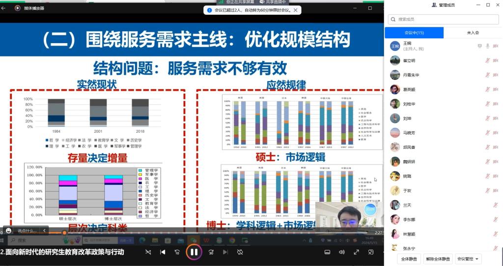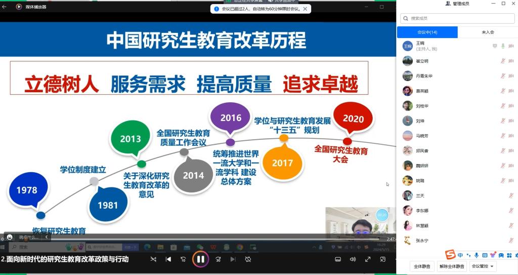 院长葛英颖主持会议,并介绍了我院要高度重视教育科学研究在教育发展和改革中的重要作用。清华大学副教授王传毅分享专题报告《面向新时代的中国研究生教育改革:近三年研究生教育重大改革政策解读》,解读分析全国研究生教育会议的战略意义,梳理一系列政策文件的逻辑体系。明确了新一轮研究生教育改革的总体目标和根本任务,并分别聚焦全面质量管理、导师队伍建设和专业学位研究生教育,对研究生教育改革作出系统部署。