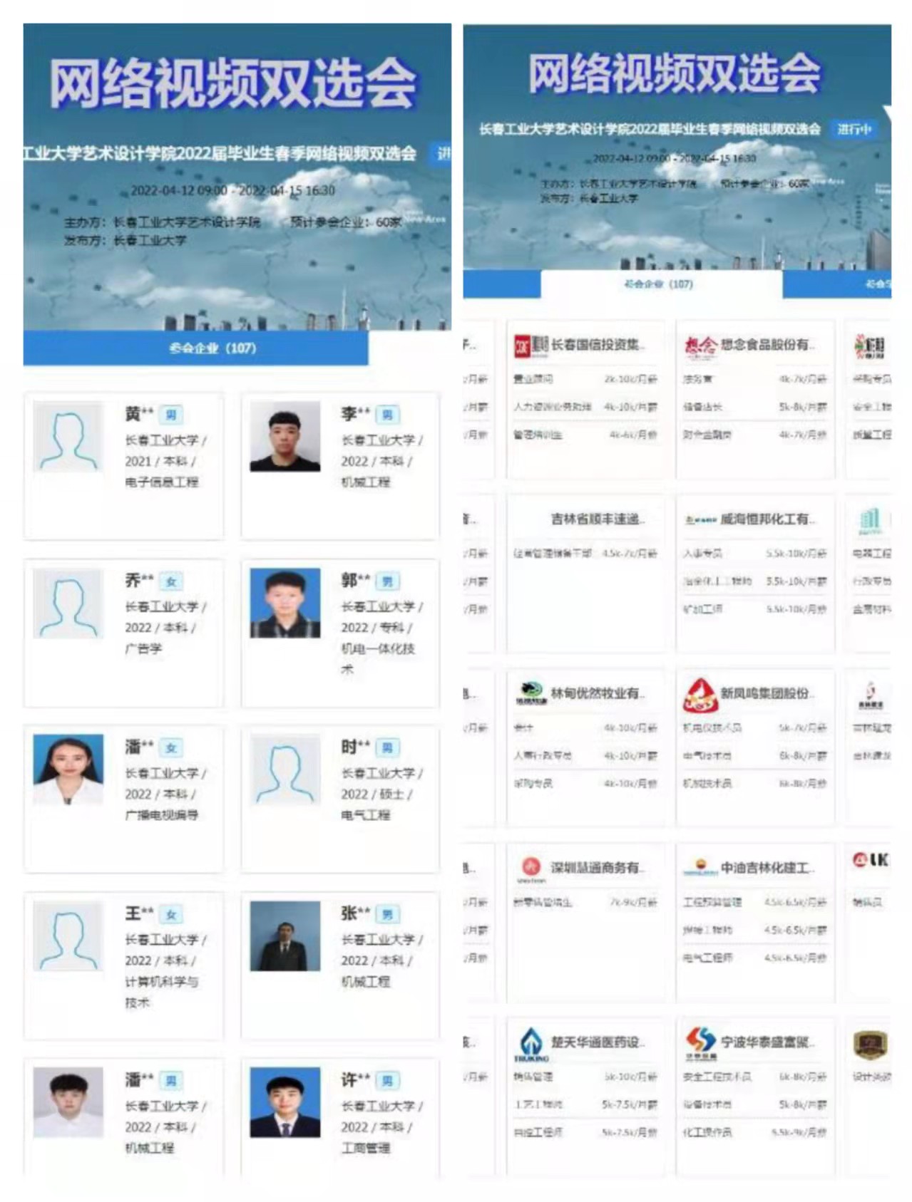 、国信集团等有艺术设计类人才招聘需求的优质企业到会近50家。线上会场内设立了长春新区等四个视频宣传专区,丰富的就业岗位为有意向专业对口就业的毕业生提供了充足的选择空间。