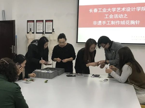 领导和老师们亲自动手,投入到绒花胸针的制作过程,享受着传统艺术带来的乐趣。