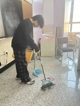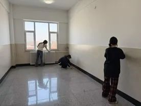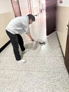 艺术楼的清洁行动更显细致入微。同学们逐层清理教室的每个角落,用刮刀清除走廊墙面胶痕,让展示栏恢复整洁面貌。当夕阳斜照进窗明几净的教室,斑驳的光影映在光洁的地面,仿佛为这份坚持写下温柔的注脚。
