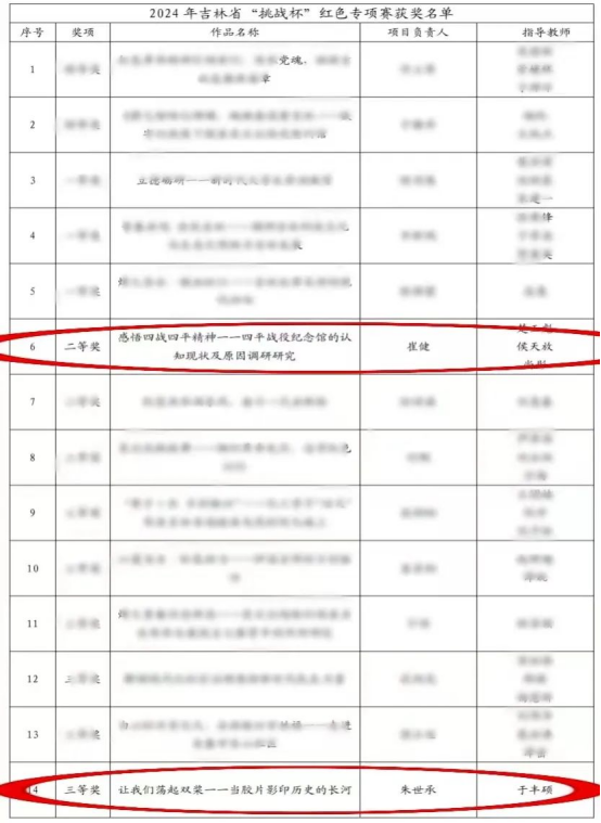 本网讯(通讯员: 宋姗珊)近日,2024年吉林省"挑战杯"红色专项赛评选结果揭晓。我院楚玉彪、侯天放、尚彤三位教师指导,崔健等10名学生完成的作品《感悟四战四平精神——四平战役纪念馆认知现状及原因调查研究》获二等奖;于丰硕指导,朱世承等4名学生完成的作品《让我们荡起双桨——胶片影印中的历史长河》获三等奖,创黄金岛