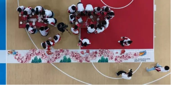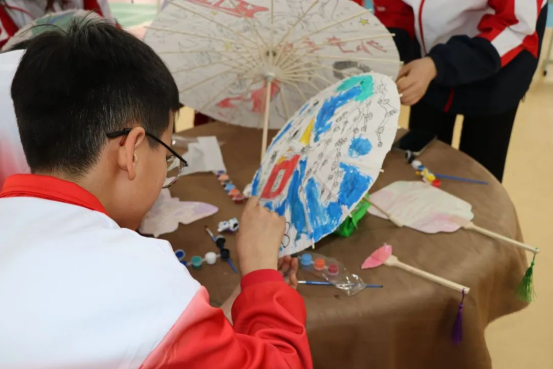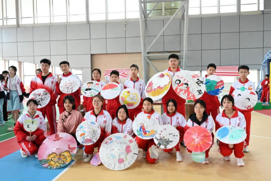 随后的活动分为文艺展演、非遗展览与市集体验三大板块,并特别设置了漆扇、油纸伞、脸谱、剪纸等传统技艺展示,讲解员详细介绍其历史渊源与制作工艺。最引人注目的,莫过于两校学生共同创作的“纸韵游龙”非遗主题作品。该作品将传统龙纹图案与现代艺术创意完美结合,学生先在纸盘上绘制祥云图案并剪出龙鳞纹样,再通过立体绘画技法制作出栩栩如生的龙头、龙爪等部件,最终将300余个装饰着剪纸龙鳞和祥云纹样的纸盘拼接成一条蜿蜒百米、气势恢宏的“中国龙”。作品既展现了非遗技艺的精妙与魅力,又传递了青年一代对中华文化的创新诠释。