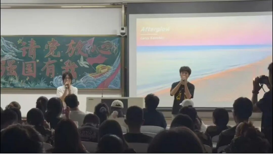 随着 11 号选手的演讲落下最后一个音节,王一诺学姐与金圣皓学长登台,演唱歌曲《虹之间》,进一步展现黄金岛