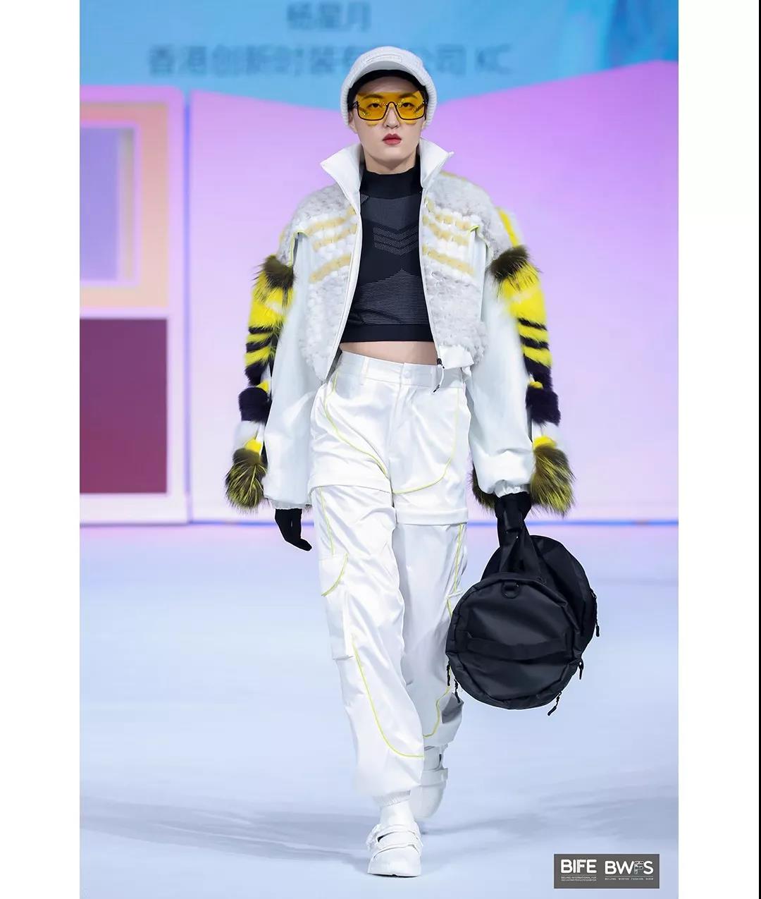 《Z世代》呈现出了年轻活力,轻盈运动的效果。对于作品,杨星月同学为其赋予了冬奥会的健康之美以及时代的意义。冬奥会是运动员们在冰雪世界的尽情涂鸦。他在设计时以皮草为颜料,涂鸦在白色的面料上从而引出她的主题“Z世代”。“出生在1999—2009年之间的Z世代正成为零售业市场的消费主体,他们追求自我,崇尚价值。由此我在袖部的皮草切割中使用了self和value两个单词的变形,以此来体现年轻一代对于自我和价值的追求”杨星月同学如是说道。