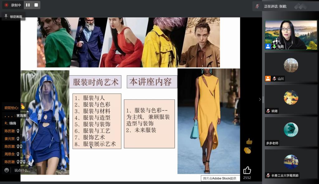 张颖老师主讲。张颖老师首先从“时尚”这一概念做了深入解读,并从时尚体现的各个方面,流行风格及设计师如何呈现时尚等方面进行了深入阐述。对于色彩的基本概念、流行色在服装上的运用和搭配进行了详细讲授。
