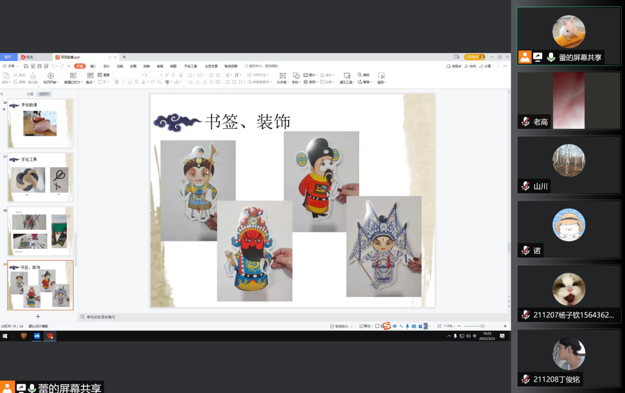 教师张蕾蕾老师主讲。云端300余人共同观看讲座,张蕾蕾老师从认识中华民族的瑰宝——京剧脸谱入手,亲自示范绘制京剧脸谱,指导同学们利用业余时间以京剧脸谱为范本制作装饰画和书签作品,疫情期间丰富自己的业余文化生活。